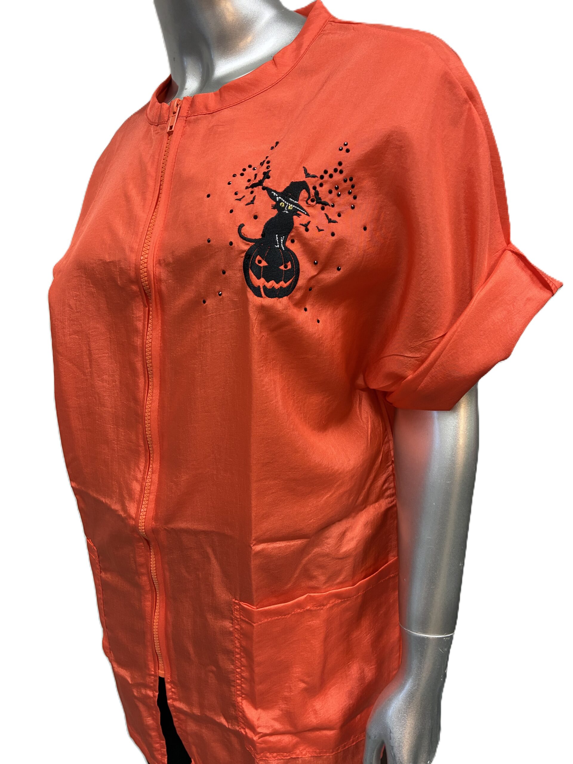 Black Cat standing on pumpkin with bats, with rhinestones to make it POP!