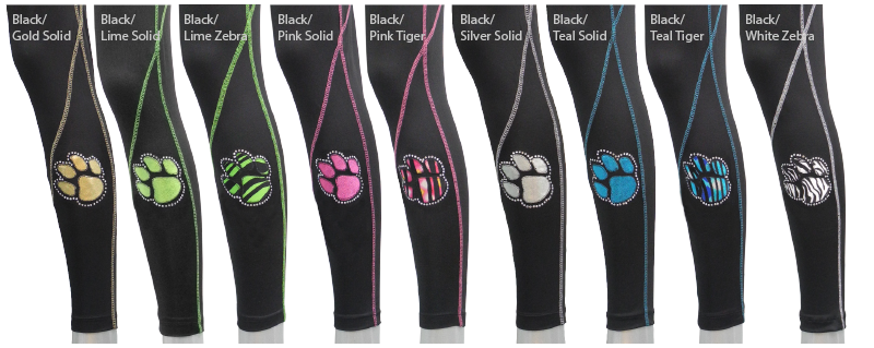 Legging with Contrast Stitching and Paw – XS, S, M, L, XL, 2XL, 3XL, 5XL. Our popular poly/spandex legging with contrast stitching for a flattering look. Detailed with contrast animal print paw and outlined in rhinestones on the left lower leg.