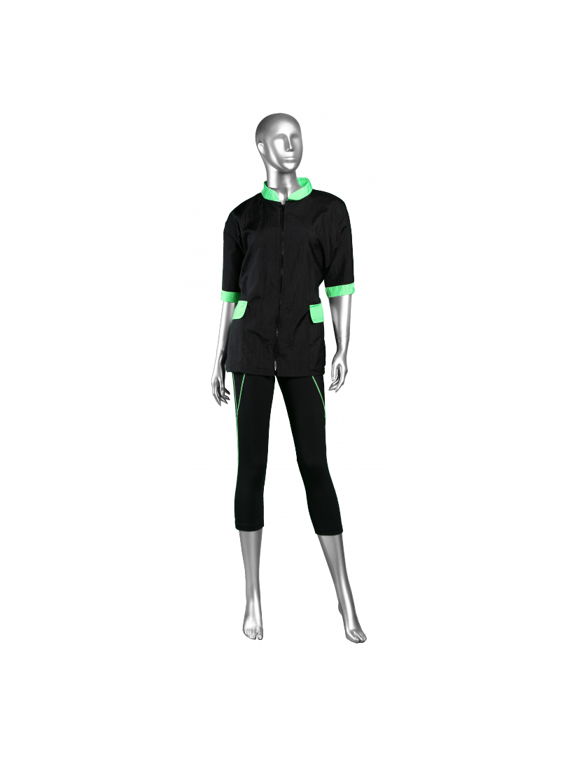 Roxy Top – XS, S, M, L, XL, 2XL, 3XL, 4XL, 5XL. This fitted jacket has contrasting details such as collar, lower sleeves, waist ties, & pocket flaps. Shown here in Black with Lime.