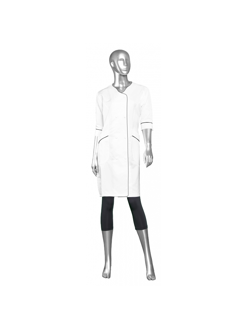 This is a ladies spa coat with a double row of snaps in the front. It is detailed with two side front pockets, 3/4 sleeves, and back slit.